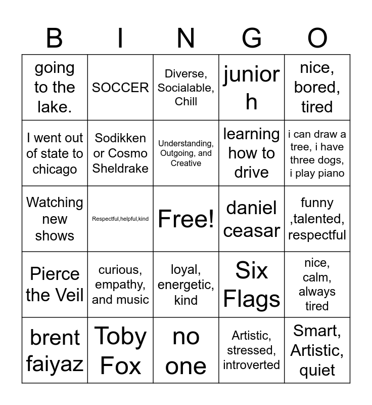 This bingo card has a free space and 42 words: loyal,sweet,and funny, Understanding, Outgoing, and Creative, creative, nice , kind, curious, empathy, and music, Artistic, stressed, introverted, nice, calm, always tired, Smart, Artistic, quiet, smart funny vibe smart, Diverse, Socialable, Chill, loyal, energetic, kind, funny ,talented, respectful, i can draw a tree, i have three dogs, i play piano, Respectful,helpful,kind, nice, bored, tired, Going to six flags, Six Flags, being with my family, Watching new shows, Going to a concert, SOCCER, I went out of state to chicago, my bed and friends, boat with my family, going to the lake., Playing video games, i went to Kansas city, learning how to drive, some what fun, nba youngboy, Partynextdoor, wave to earth, Pierce the Veil, Sodikken or Cosmo Sheldrake, no one, my current favorite artist coldplay, brent faiyaz, Toby Fox, daniel ceasar, dont have one, arctic monkeys, junior h and I dont have one.