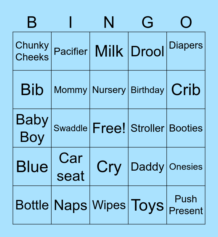 This bingo card has a free space and 24 words: Bottle, Car seat, Nursery, Toys, Diapers, Chunky Cheeks, Pacifier, Milk, Stroller, Booties, Baby Boy, Mommy, Daddy, Onesies, Bib, Naps, Wipes, Drool, Crib, Blue, Swaddle, Cry, Birthday and Push Present.