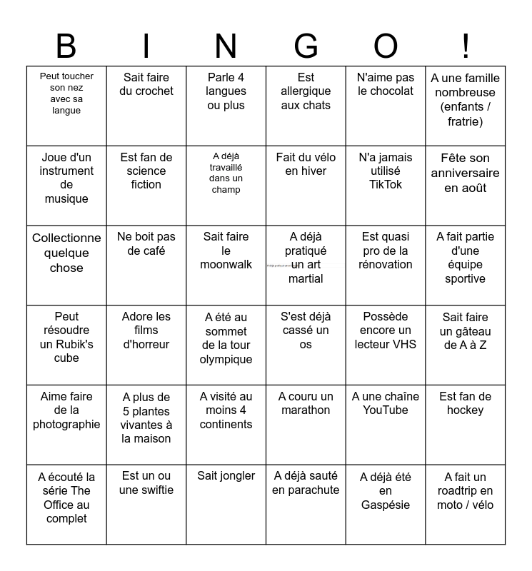 This bingo card has 1 images and 36 words: A couru un marathon, A visité au moins 4 continents, A déjà sauté en parachute, Joue d'un instrument de musique, Peut résoudre un Rubik's cube, A déjà pratiqué un art martial, Est fan de science fiction, Sait jongler, N'aime pas le chocolat, A une chaîne YouTube, Fête son anniversaire en août, Est allergique aux chats, Est fan de hockey, Ne boit pas de café, Fait du vélo en hiver, Peut toucher son nez avec sa langue, Aime faire de la photographie, Est quasi pro de la rénovation, Collectionne quelque chose, Parle 4 langues ou plus, Sait faire le moonwalk, Adore les films d'horreur, S'est déjà cassé un os, A été au sommet de la tour olympique, Possède encore un lecteur VHS, Sait faire du crochet, N'a jamais utilisé TikTok, Est un ou une swiftie, A déjà travaillé dans un champ, A une famille nombreuse (enfants / fratrie), A fait un roadtrip en moto / vélo, A écouté la série The Office au complet, Sait faire un gâteau de A à Z, A fait partie d'une équipe sportive, A plus de 5 plantes vivantes à la maison and A déjà été en Gaspésie.