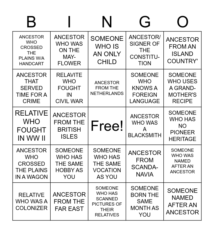 This bingo card has a free space and 24 words: SOMEONE WHO HAS THE SAME HOBBY AS YOU, ANCESTOR FROM THE FAR EAST, ANCESTOR FROM THE NETHERLANDS, RELATIVE WHO WAS A COLONIZER, ANCESTOR FROM AN ISLAND COUNTRY', ANCESTOR WHO CROSSED THE PLAINS W/A HANDCART, ANCESTOR THAT SERVED TIME FOR A CRIME, ANCESTOR WHO WAS ON THE MAY- FLOWER, ANCESTOR WHO WAS A BLACKSMITH, SOMEONE WHO HAS THE SAME VOCATION AS YOU, SOMEONE WHO KNOWS A FOREIGN LANGUAGE, RELATIVE WHO FOUGHT IN WW II, ANCESTOR FROM SCANDA- NAVIA, SOMEONE WHO WAS NAMED AFTER AN ANCESTOR, RELAVITE WHO FOUGHT IN CIVIL WAR, SOMEONE BORN THE SAME MONTH AS YOU, SOMEONE WHO HAS NO PIONEER HERITAGE, SOMEONE WHO IS AN ONLY CHILD, SOMEONE WHO USES A GRAND- MOTHER'S RECIPE, ANCESTOR FROM THE BRITISH ISLES, SOMEONE NAMED AFTER AN ANCESTOR, ANCESTOR WHO CROSSED THE PLAINS IN A WAGON, ANCESTOR/ SIGNER OF THE CONSTITU- TION and SOMEONE WHO HAS SCANNED PICTURES OF THEIR RELATIVES.