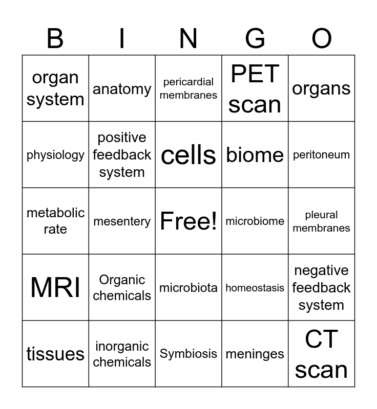 This bingo card has a free space and 24 words: Organic chemicals, inorganic chemicals, cells, tissues, organs, organ system, physiology, anatomy, microbiome, microbiota, biome, metabolic rate, homeostasis, negative feedback system, positive feedback system, meninges, pleural membranes, pericardial membranes, peritoneum, mesentery, CT scan, MRI, PET scan and Symbiosis.
