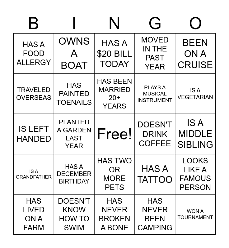 This bingo card has a free space and 24 words: HAS A DECEMBER BIRTHDAY, DOESN'T KNOW HOW TO SWIM, HAS BEEN MARRIED 20+ YEARS, HAS LIVED ON A FARM, BEEN ON A CRUISE, HAS A FOOD ALLERGY, TRAVELED OVERSEAS, OWNS A BOAT, DOESN'T DRINK COFFEE, HAS TWO OR MORE PETS, PLAYS A MUSICAL INSTRUMENT, IS LEFT HANDED, HAS A TATTOO, LOOKS LIKE A FAMOUS PERSON, HAS PAINTED TOENAILS, HAS NEVER BEEN CAMPING, IS A MIDDLE SIBLING, HAS A $20 BILL TODAY, IS A VEGETARIAN, PLANTED A GARDEN LAST YEAR, WON A TOURNAMENT, IS A GRANDFATHER, MOVED IN THE PAST YEAR and HAS NEVER BROKEN A BONE.
