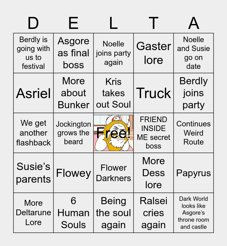 This bingo card has a free space and 24 words: Flowey, 6 Human Souls, Kris takes out Soul, More Deltarune Lore, Noelle and Susie go on date, Berdly is going with us to festival, Asriel, Asgore as final boss, FRIEND INSIDE ME secret boss, Flower Darkners, Truck, We get another flashback, More Dess lore, Papyrus, More about Bunker, Ralsei cries again, Continues Weird Route, Noelle joins party again, Berdly joins party, Jockington grows the beard, Dark World looks like Asgore’s throne room and castle, Susie’s parents, Gaster lore and Being the soul again.
