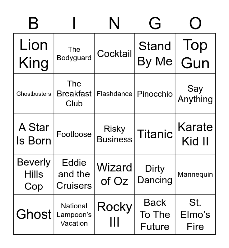 This bingo card has 25 words: Eddie and the Cruisers, Rocky III, Flashdance, Ghost, Top Gun, Lion King, Ghostbusters, The Bodyguard, Titanic, Wizard of Oz, Pinocchio, A Star Is Born, Dirty Dancing, Mannequin, The Breakfast Club, St. Elmo’s Fire, Karate Kid II, Cocktail, Say Anything, Footloose, Risky Business, National Lampoon’s Vacation, Beverly Hills Cop, Stand By Me and Back To The Future.