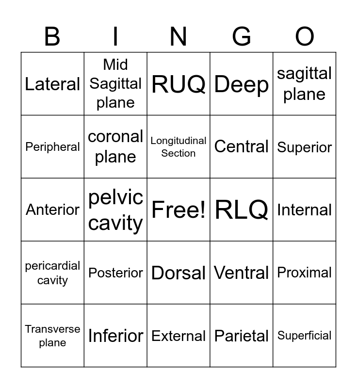 This bingo card has a free space and 33 words: Cranial cavitty, thoracic cavity, pelvic cavity, abdominal cavity, pericardial cavity, coronal plane, sagittal plane, Transverse plane, Mid Sagittal plane, Cross-section, Longitudinal Section, RUQ, LUQ, LLQ, RLQ, Superior, Inferior, Anterior, Posterior, Ventral, Dorsal, Medial, Lateral, Internal, External, Superficial, Deep, Central, Peripheral, Proximal, Distal, Parietal and Visceral.