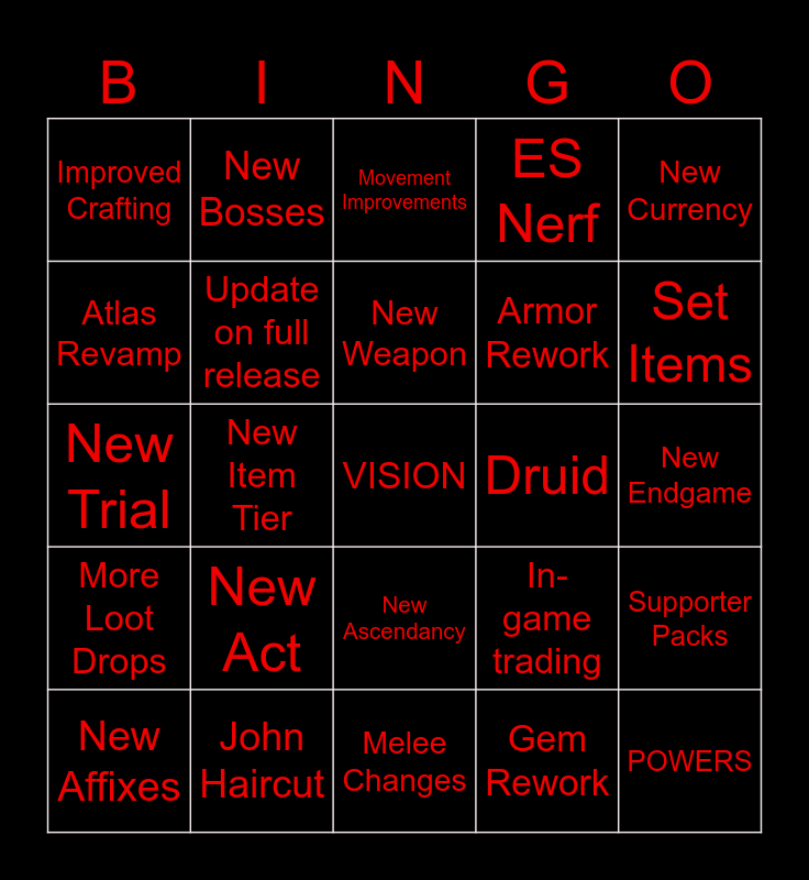 This bingo card has a free space and 24 words: New Act, John Haircut, New Weapon, New Affixes, New Currency, Improved Crafting, Atlas Revamp, New Bosses, Druid, New Ascendancy, Armor Rework, New Trial, In-game trading, Supporter Packs, Update on full release, Gem Rework, New Endgame, Movement Improvements, Set Items, New Item Tier, POWERS, More Loot Drops, ES Nerf and Melee Changes.