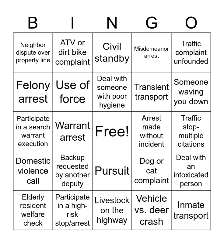 This bingo card has a free space and 31 words: Livestock on the highway, Deal with a naked person, Warrant arrest, Medical call assist, Neighbor dispute over property line, Civil standby, Use of force, Dog or cat complaint, Arrest made without incident, Vehicle vs. deer crash, Traffic stop-multiple citations, Inmate transport, Road hazard, Solve a case with an unknown suspect, Someone waving you down, DUI, Deal with an intoxicated person, Backup requested by another deputy, Domestic violence call, Pursuit, Traffic complaint unfounded, Attempt to serve papers-nobody home, Elderly resident welfare check, ATV or dirt bike complaint, Transient transport, Felony arrest, Misdemeanor arrest, Participate in a search warrant execution, Participate in a high-risk stop/arrest, Deal with someone with poor hygiene and Civil issue.