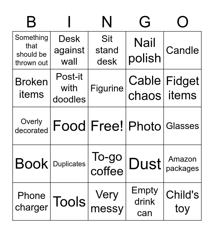 This bingo card has a free space and 39 words: Plant, Cat, Plant, Post-it with doodles, Phone charger, To-go coffee, Figurine, Head phones, Candle, Book, Food, Nail polish, Child's toy, Glasses, Photo, Duplicates, Exercise equipment, Something that should be thrown out, Super old tech, Dust, Broken items, Very messy, Cable chaos, Fidget items, Extremely neat, Mood lighting, Funko pops, Dual screens, Desk against window, Desk against wall, Junk drawer, Not a desk, Sit stand desk, Tools, Empty drink can, No mousepad, Amazon packages, Overly decorated and Stacks of papers.