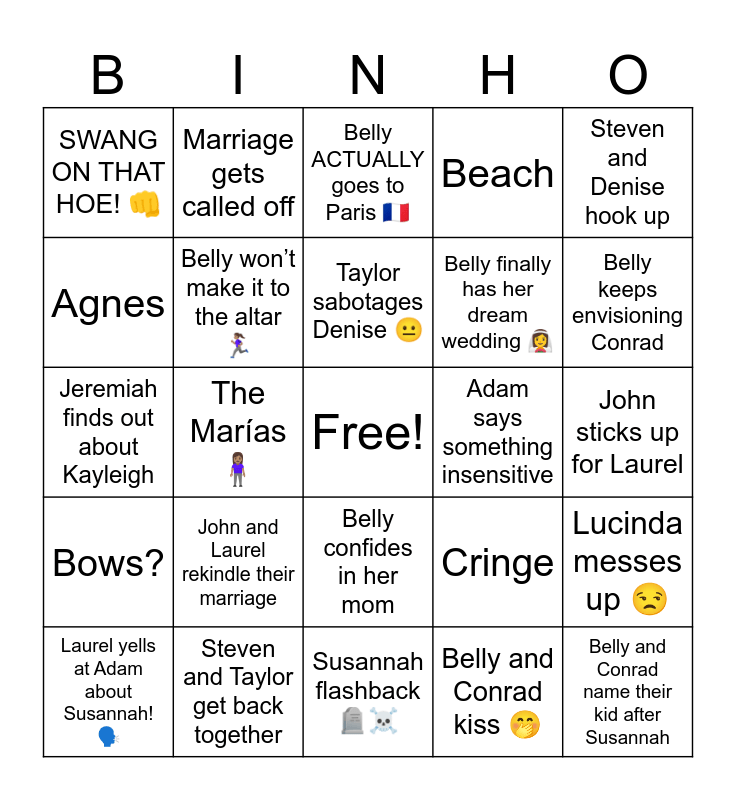 This bingo card has a free space and 24 words: Laurel yells at Adam about Susannah! π£οΈ, John and Laurel rekindle their marriage, Taylor sabotages Denise π, Belly and Conrad kiss π€, Steven and Denise hook up, SWANG ON THAT HOE! π, Marriage gets called off, Belly ACTUALLY goes to Paris π«π·, Adam says something insensitive, John sticks up for Laurel, Jeremiah finds out about Kayleigh, Belly wonβt make it to the altar ππ½ββοΈ, Cringe, Lucinda messes up π, Agnes, Steven and Taylor get back together, Susannah flashback πͺ¦β οΈ, Beach, Belly keeps envisioning Conrad, Bows?, The MarΓas π§π½ββοΈ, Belly confides in her mom, Belly finally has her dream wedding π°ββοΈ and Belly and Conrad name their kid after Susannah.