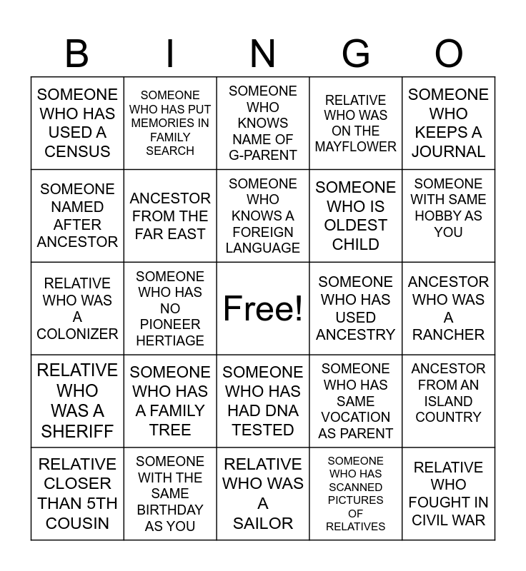 This bingo card has a free space and 24 words: SOMEONE WHO HAS A FAMILY TREE, SOMEONE WITH THE SAME BIRTHDAY AS YOU, SOMEONE WHO KNOWS A FOREIGN LANGUAGE, RELATIVE CLOSER THAN 5TH COUSIN, SOMEONE WHO KEEPS A JOURNAL, SOMEONE WHO HAS USED A CENSUS, SOMEONE NAMED AFTER ANCESTOR, SOMEONE WHO HAS PUT MEMORIES IN FAMILY SEARCH, SOMEONE WHO HAS USED ANCESTRY, SOMEONE WHO HAS HAD DNA TESTED, SOMEONE WHO IS OLDEST CHILD, RELATIVE WHO WAS A COLONIZER, SOMEONE WHO HAS SAME VOCATION AS PARENT, ANCESTOR FROM AN ISLAND COUNTRY, ANCESTOR FROM THE FAR EAST, SOMEONE WHO HAS SCANNED PICTURES OF RELATIVES, ANCESTOR WHO WAS A RANCHER, SOMEONE WHO KNOWS NAME OF G-PARENT, SOMEONE WITH SAME HOBBY AS YOU, SOMEONE WHO HAS NO PIONEER HERTIAGE, RELATIVE WHO FOUGHT IN CIVIL WAR, RELATIVE WHO WAS A SHERIFF, RELATIVE WHO WAS ON THE MAYFLOWER and RELATIVE WHO WAS A SAILOR.