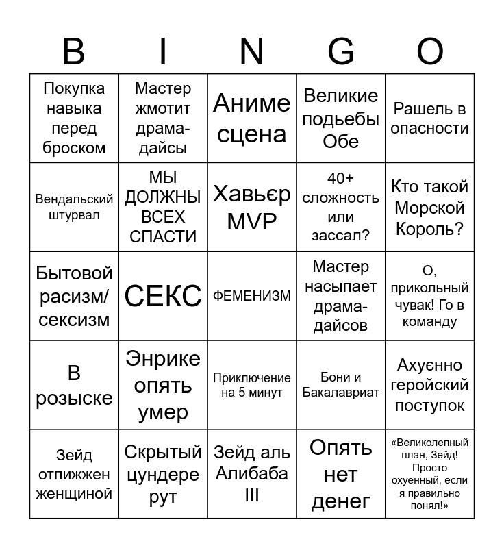 This bingo card has a free space and 24 words: Энрике опять умер, Скрытый цундере рут, Хавьєр MVP, Зейд отпижжен женщиной, Рашель в опасности, Покупка навыка перед броском, Вендальский штурвал, Мастер жмотит драма-дайсы, Мастер насыпает драма-дайсов, Приключение на 5 минут, 40+ сложность или зассал?, Бытовой расизм/сексизм, Бони и Бакалавриат, Ахуєнно геройский поступок, МЫ ДОЛЖНЫ ВСЕХ СПАСТИ, Опять нет денег, О, прикольный чувак! Го в команду, Аниме сцена, Кто такой Морской Король?, СЕКС, «Великолепный план, Зейд! Просто охуенный, если я правильно понял!», В розыске, Великие подьебы Обе and Зейд аль Алибаба ІІІ.