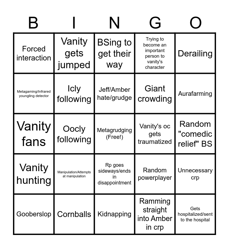 This bingo card has a free space and 24 words: Manipulation/Attempts at manipulation, Cornballs, Jeff/Amber hate/grudge, Gooberslop, Derailing, Forced interaction, Metagaming/Infrared youngling detector, Vanity gets jumped, Vanity's oc gets traumatized, Rp goes sideways/ends in disappointment, Giant crowding, Vanity fans, Random powerplayer, Unnecessary crp, Icly following, Ramming straight into Amber in crp, Random "comedic relief" BS, BSing to get their way, Aurafarming, Oocly following, Gets hospitalized/sent to the hospital, Vanity hunting, Trying to become an important person to vanity's character and Kidnapping.