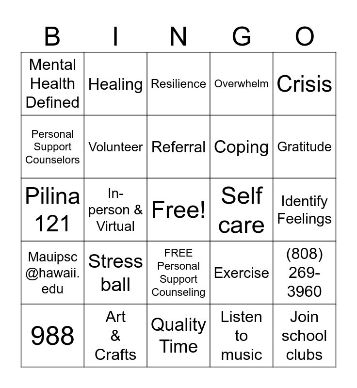 This bingo card has a free space and 25 words: 988, Stress ball, Referral, Listen to music, Gratitude, Mental Health Defined, Healing, Resilience, Coping, (808) 269-3960, Pilina 121, Volunteer, Exercise, Join school clubs, Personal Support Counselors, Art & Crafts, Quality Time, Overwhelm, Identify Feelings, Mauipsc @hawaii. edu, In-person & Virtual, FREE Personal Support Counseling, Self care, Crisis and **FREE SPACE**.