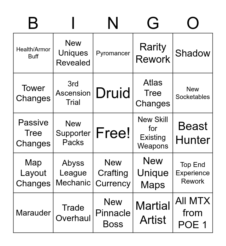 This bingo card has a free space and 24 words: Abyss League Mechanic, Trade Overhaul, Druid, Marauder, Shadow, Health/Armor Buff, Tower Changes, New Uniques Revealed, New Skill for Existing Weapons, New Crafting Currency, Atlas Tree Changes, Passive Tree Changes, New Unique Maps, Top End Experience Rework, 3rd Ascension Trial, Martial Artist, Beast Hunter, Pyromancer, New Socketables, New Supporter Packs, All MTX from POE 1, Map Layout Changes, Rarity Rework and New Pinnacle Boss.
