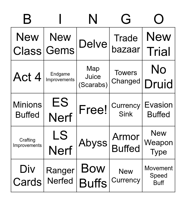 This bingo card has a free space and 24 words: LS Nerf, Ranger Nerfed, Map Juice (Scarabs), Div Cards, New Trial, New Class, Act 4, New Gems, Currency Sink, Abyss, Towers Changed, Minions Buffed, Armor Buffed, New Weapon Type, Endgame Improvements, New Currency, Evasion Buffed, Delve, No Druid, ES Nerf, Movement Speed Buff, Crafting Improvements, Trade bazaar and Bow Buffs.