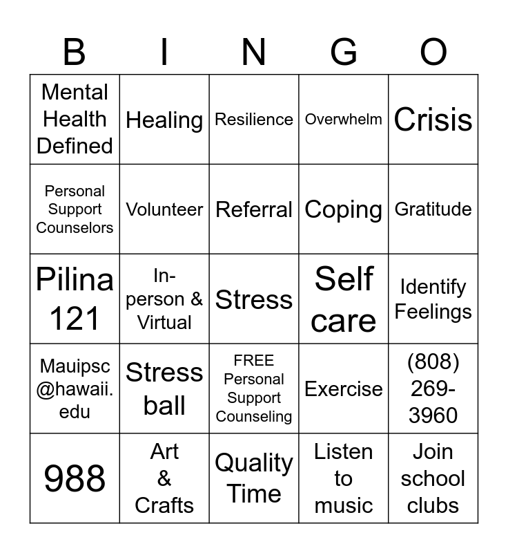 This bingo card has a free space and 25 words: 988, Stress ball, Referral, Listen to music, Gratitude, Mental Health Defined, Healing, Resilience, Coping, (808) 269-3960, Pilina 121, Volunteer, Exercise, Join school clubs, Personal Support Counselors, Art & Crafts, Quality Time, Overwhelm, Identify Feelings, Mauipsc @hawaii. edu, In-person & Virtual, FREE Personal Support Counseling, Self care, Crisis and **FREE SPACE**.