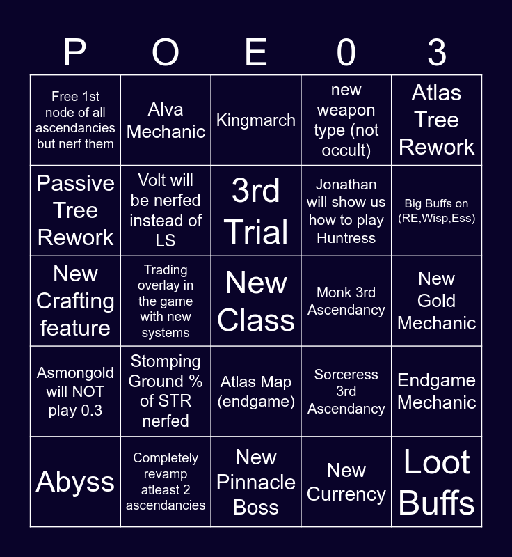This bingo card has a free space and 24 words: Stomping Ground % of STR nerfed, Completely revamp atleast 2 ascendancies, 3rd Trial, Abyss, Atlas Tree Rework, Free 1st node of all ascendancies but nerf them, Passive Tree Rework, Alva Mechanic, Monk 3rd Ascendancy, Atlas Map (endgame), Jonathan will show us how to play Huntress, New Crafting feature, Sorceress 3rd Ascendancy, Endgame Mechanic, Volt will be nerfed instead of LS, New Currency, New Gold Mechanic, Kingmarch, Big Buffs on (RE,Wisp,Ess), Trading overlay in the game with new systems, Loot Buffs, Asmongold will NOT play 0.3, new weapon type (not occult) and New Pinnacle Boss.