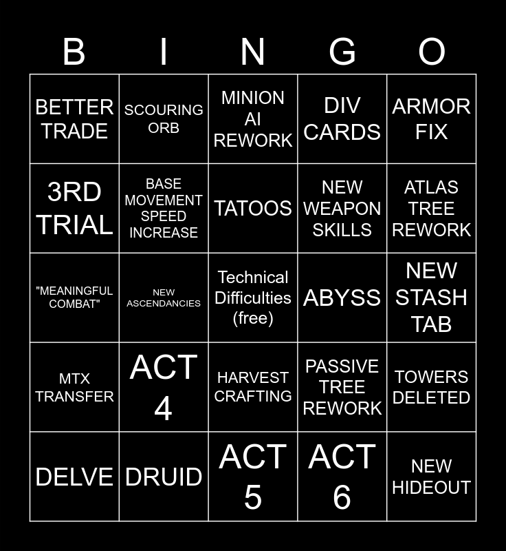 This bingo card has a free space and 24 words: ACT 4, DRUID, TATOOS, DELVE, ARMOR FIX, BETTER TRADE, 3RD TRIAL, SCOURING ORB, ABYSS, HARVEST CRAFTING, NEW WEAPON SKILLS, "MEANINGFUL COMBAT", PASSIVE TREE REWORK, TOWERS DELETED, BASE MOVEMENT SPEED INCREASE, ACT 6, NEW STASH TAB, MINION AI REWORK, ATLAS TREE REWORK, NEW ASCENDANCIES, NEW HIDEOUT, MTX TRANSFER, DIV CARDS and ACT 5.