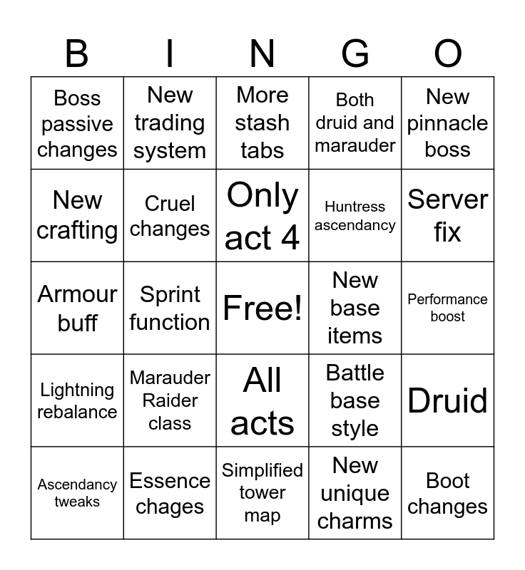This bingo card has a free space and 24 words: Marauder Raider class, Essence chages, Only act 4, Ascendancy tweaks, New pinnacle boss, Boss passive changes, New crafting, New trading system, New base items, All acts, Huntress ascendancy, Armour buff, Battle base style, Druid, Cruel changes, New unique charms, Performance boost, More stash tabs, Server fix, Sprint function, Boot changes, Lightning rebalance, Both druid and marauder and Simplified tower map.