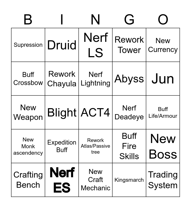 This bingo card has a free space and 24 words: Expedition Buff, Nerf ES, Nerf Lightning, Crafting Bench, New Currency, Supression, Buff Crossbow, Druid, Nerf Deadeye, Rework Atlas/Passive tree, Abyss, New Weapon, Buff Fire Skills, New Boss, Rework Chayula, Kingsmarch, Buff Life/Armour, Nerf LS, Jun, Blight, Trading System, New Monk ascendency, Rework Tower and New Craft Mechanic.