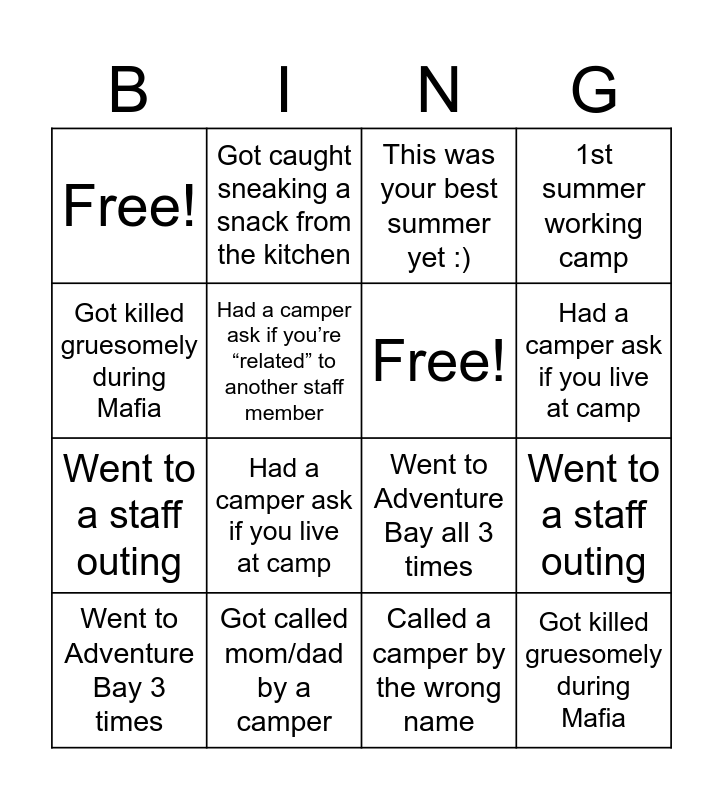 ⚠ This card has duplicate items: Free! (2), Had a camper ask if you live at camp (2), 1st summer working camp (2)