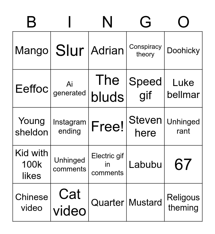 This bingo card has a free space and 24 words: Unhinged comments, Cat video, The bluds, Chinese video, Doohicky, Mango, Eeffoc, Slur, Steven here, Electric gif in comments, Speed gif, Young sheldon, Labubu, 67, Ai generated, Mustard, Unhinged rant, Adrian, Luke bellmar, Instagram ending, Religous theming, Kid with 100k likes, Conspiracy theory and Quarter.
