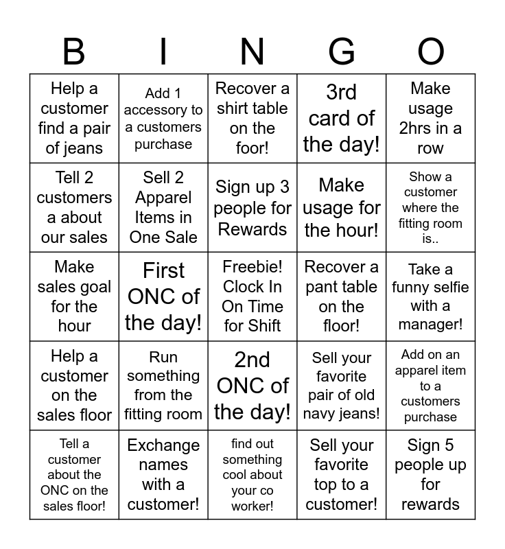 This bingo card has a free space and 24 words: Run something from the fitting room, Exchange names with a customer!, Sign up 3 people for Rewards, Tell a customer about the ONC on the sales floor!, Make usage 2hrs in a row, Help a customer find a pair of jeans, Tell 2 customers a about our sales, Add 1 accessory to a customers purchase, Recover a pant table on the floor!, 2nd ONC of the day!, Make usage for the hour!, Make sales goal for the hour, Sell your favorite pair of old navy jeans!, Add on an apparel item to a customers purchase, Sell 2 Apparel Items in One Sale, Sell your favorite top to a customer!, Take a funny selfie with a manager!, Recover a shirt table on the foor!, Show a customer where the fitting room is.., First ONC of the day!, Sign 5 people up for rewards, Help a customer on the sales floor, 3rd card of the day! and find out something cool about your co worker!.