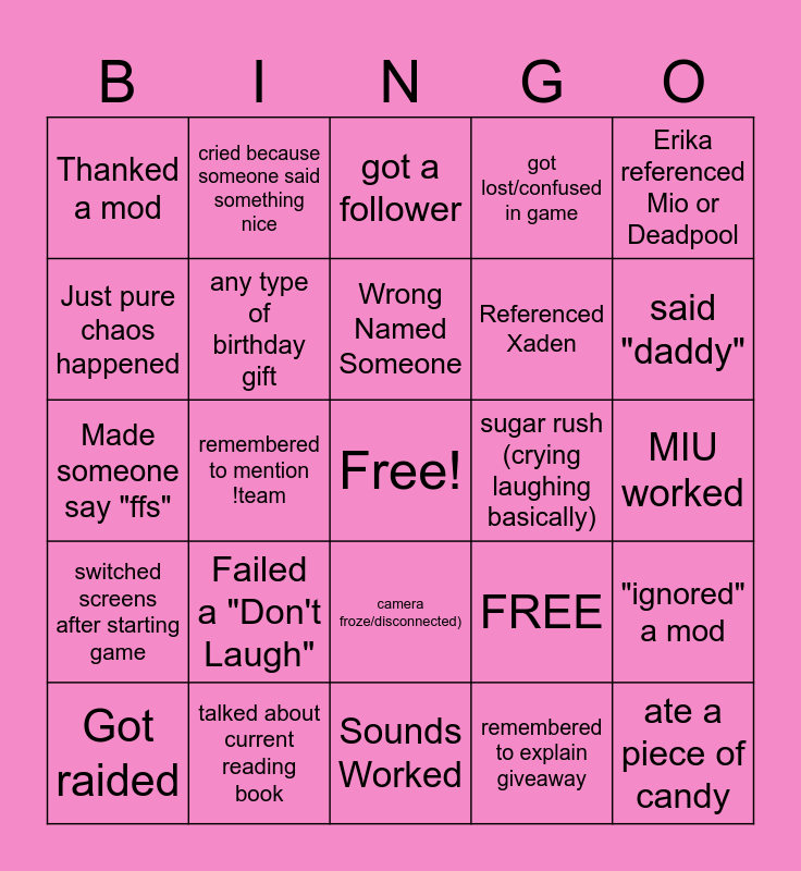 This bingo card has a free space and 25 words: Failed a "Don't Laugh", Sounds Worked, Wrong Named Someone, Got raided, Erika referenced Mio or Deadpool, Thanked a mod, Just pure chaos happened, cried because someone said something nice, sugar rush (crying laughing basically), camera froze/disconnected), Referenced Xaden, Made someone say "ffs", FREE, "ignored" a mod, any type of birthday gift, sub/gifted sub, MIU worked, got a follower, said "daddy", remembered to mention !team, ate a piece of candy, talked about current reading book, switched screens after starting game, got lost/confused in game and remembered to explain giveaway.
