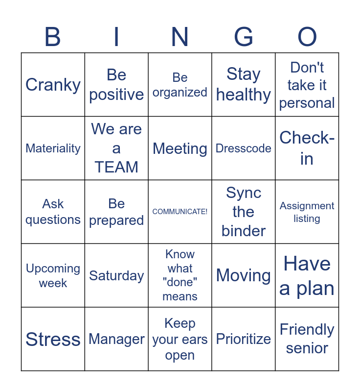 This bingo card has a free space and 24 words: Saturday, Manager, Meeting, Stress, Don't take it personal, Cranky, Materiality, Be positive, Sync the binder, Know what "done" means, Dresscode, Ask questions, Moving, Have a plan, We are a TEAM, Prioritize, Assignment listing, Be organized, Check-in, Be prepared, Friendly senior, Upcoming week, Stay healthy and Keep your ears open.