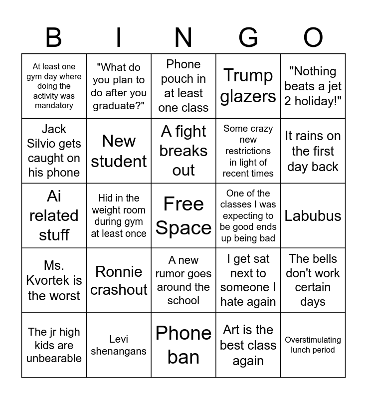 This bingo card has a free space and 24 words: Ronnie crashout, Levi shenangans, A fight breaks out, The jr high kids are unbearable, "Nothing beats a jet 2 holiday!", At least one gym day where doing the activity was mandatory, Jack Silvio gets caught on his phone, "What do you plan to do after you graduate?", One of the classes I was expecting to be good ends up being bad, A new rumor goes around the school, Some crazy new restrictions in light of recent times, Ai related stuff, I get sat next to someone I hate again, The bells don't work certain days, New student, Art is the best class again, Labubus, Phone pouch in at least one class, It rains on the first day back, Hid in the weight room during gym at least once, Overstimulating lunch period, Ms. Kvortek is the worst, Trump glazers and Phone ban.