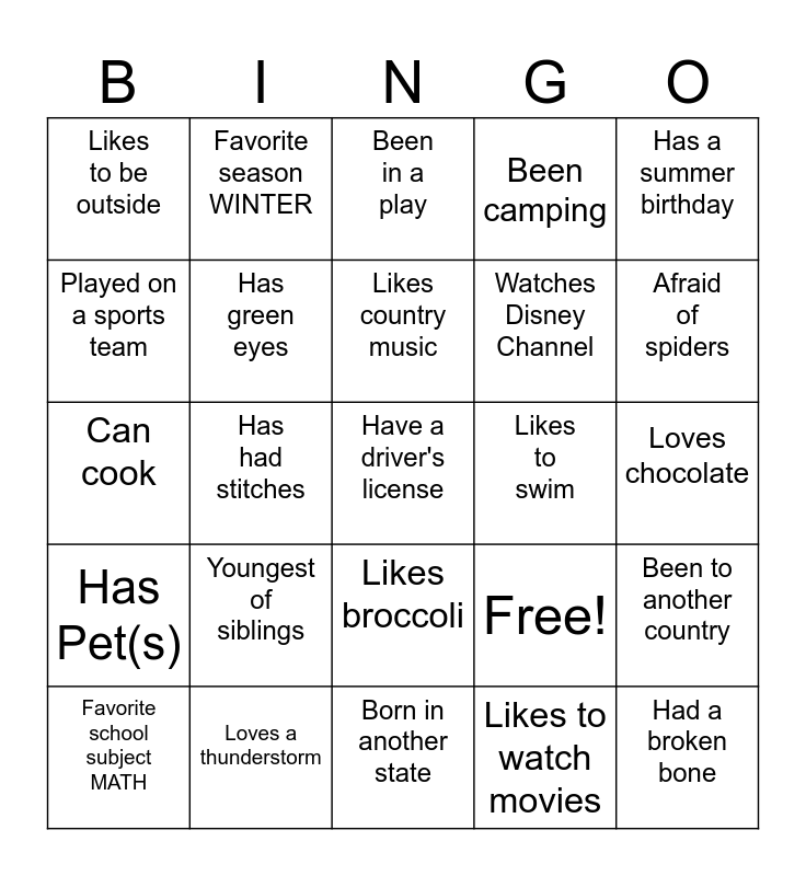 This bingo card has 25 words: Youngest of siblings, Born in another state, Likes country music, Favorite school subject MATH, Has a summer birthday, Likes to be outside, Played on a sports team, Favorite season WINTER, Likes to swim, Likes broccoli, Watches Disney Channel, Can cook, Free!, Been to another country, Has green eyes, Had a broken bone, Loves chocolate, Been in a play, Afraid of spiders, Has had stitches, Have a driver's license, Loves a thunderstorm, Has Pet(s), Been camping and Likes to watch movies.