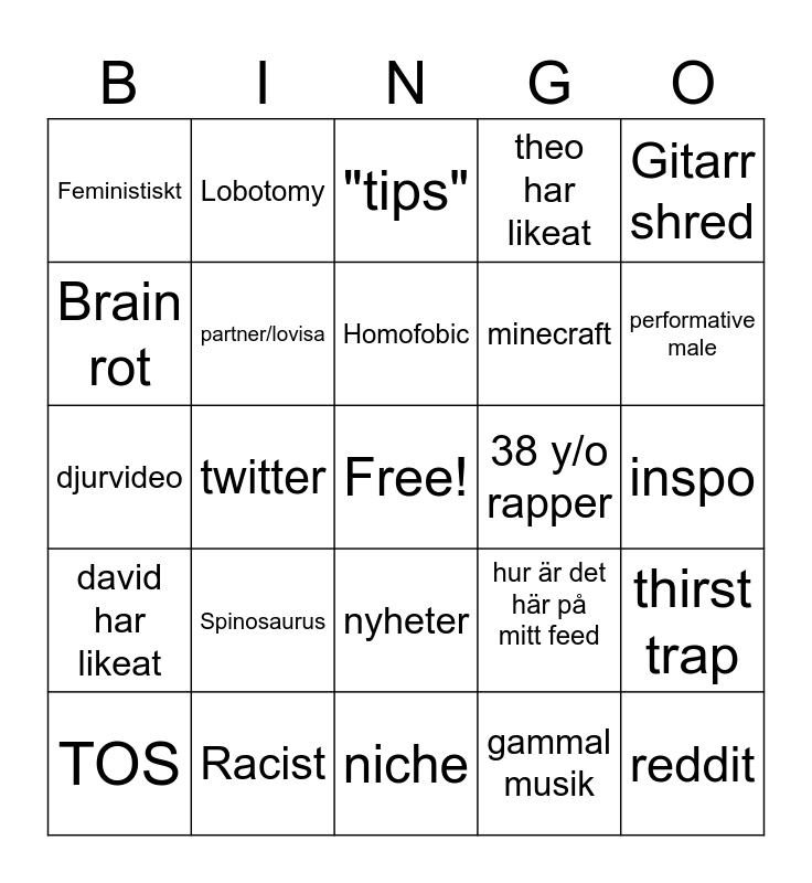 This bingo card has a free space and 24 words: Spinosaurus, Racist, Homofobic, TOS, Gitarr shred, Feministiskt, Brain rot, Lobotomy, 38 y/o rapper, nyheter, minecraft, djurvideo, hur är det här på mitt feed, thirst trap, partner/lovisa, gammal musik, inspo, "tips", performative male, twitter, reddit, david har likeat, theo har likeat and niche.