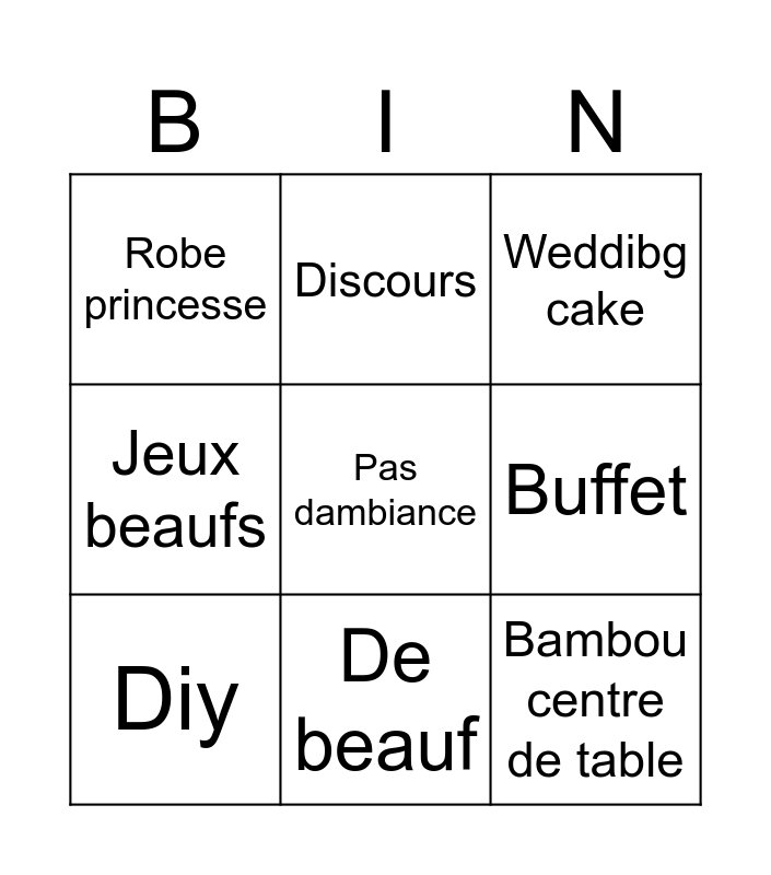 This bingo card has a free space and 8 words: Buffet, Weddibg cake, Discours, Diy, Robe princesse, Bambou centre de table, Jeux beaufs and De beauf.