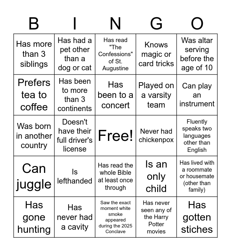 This bingo card has a free space and 24 words: Is lefthanded, Has never had a cavity, Has been to a concert, Has gone hunting, Was altar serving before the age of 10, Has more than 3 siblings, Prefers tea to coffee, Has had a pet other than a dog or cat, Never had chickenpox, Has read the whole Bible at least once through, Played on a varsity team, Was born in another country, Is an only child, Has lived with a roommate or housemate (other than family), Has been to more than 3 continents, Has never seen any of the Harry Potter movies, Fluently speaks two languages other than English, Has read "The Confessions" of St. Augustine, Can play an instrument, Doesn't have their full driver's license, Has gotten stiches, Can juggle, Knows magic or card tricks and Saw the exact moment white smoke appeared during the 2025 Conclave.