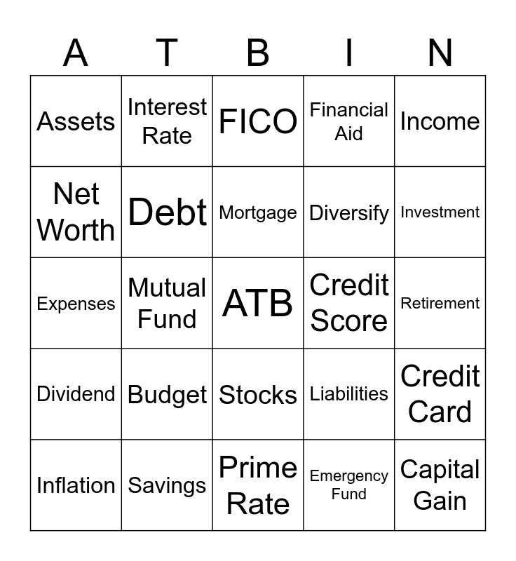 This bingo card has a free space and 24 words: Budget, Savings, Mortgage, Inflation, Income, Assets, Net Worth, Interest Rate, Credit Score, Stocks, Diversify, Expenses, Liabilities, Credit Card, Debt, Emergency Fund, Retirement, FICO, Investment, Mutual Fund, Capital Gain, Dividend, Financial Aid and Prime Rate.