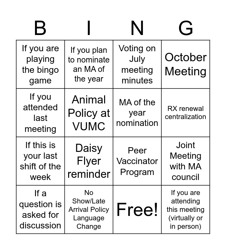 This bingo card has 17 words: Free!, If a question is asked for discussion, Voting on July meeting minutes, If you are playing the bingo game, Daisy Flyer reminder, October Meeting, Joint Meeting with MA council, MA of the year nomination, RX renewal centralization, Animal Policy at VUMC, No Show/Late Arrival Policy Language Change, Peer Vaccinator Program, If you attended last meeting, If you plan to nominate an MA of the year, If this is your last shift of the week, Safety Moment and If you are attending this meeting (virtually or in person).