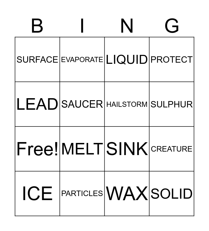 This bingo card has a free space and 15 words: ICE, SOLID, LIQUID, SURFACE, SULPHUR, LEAD, MELT, WAX, SAUCER, Free!, CREATURE, PROTECT, HAILSTORM, EVAPORATE and PARTICLES.