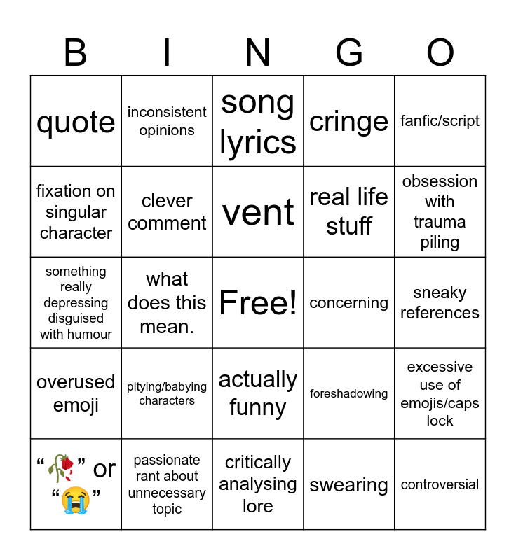 This bingo card has a free space and 24 words: pitying/babying characters, passionate rant about unnecessary topic, vent, “🥀” or “😭”, fanfic/script, quote, fixation on singular character, inconsistent opinions, concerning, actually funny, real life stuff, something really depressing disguised with humour, foreshadowing, excessive use of emojis/caps lock, clever comment, swearing, sneaky references, song lyrics, obsession with trauma piling, what does this mean., controversial, overused emoji, cringe and critically analysing lore.