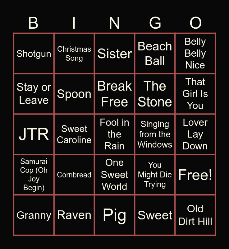 This bingo card has 28 words: Free!, Sorry those are the wrong songs… these are the right ones, The Stone, Sweet, Stay or Leave, Sister, Christmas Song, Samurai Cop (Oh Joy Begin), Singing from the Windows, Granny, JTR, Beach Ball, Raven, Pig, That Girl Is You, American Baby Intro, Cornbread, Spoon, Break Free, One Sweet World, Shotgun, Old Dirt Hill, Fool in the Rain, Sweet Caroline, Lover Lay Down, You Might Die Trying, Belly Belly Nice and She.