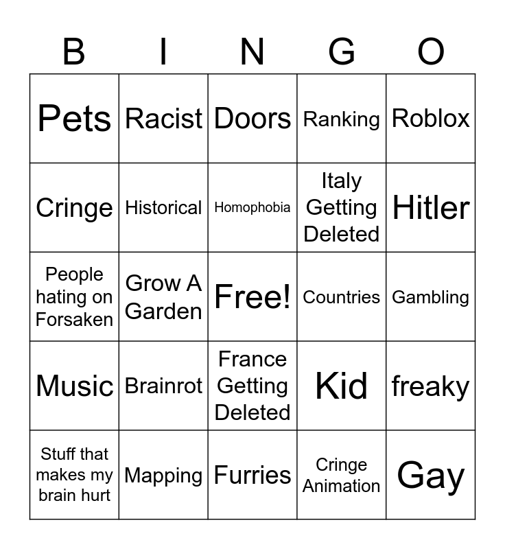 This bingo card has a free space and 24 words: Brainrot, Mapping, Homophobia, Stuff that makes my brain hurt, Roblox, Pets, Cringe, Racist, Countries, France Getting Deleted, Italy Getting Deleted, People hating on Forsaken, Kid, freaky, Historical, Cringe Animation, Gambling, Doors, Hitler, Grow A Garden, Gay, Music, Ranking and Furries.