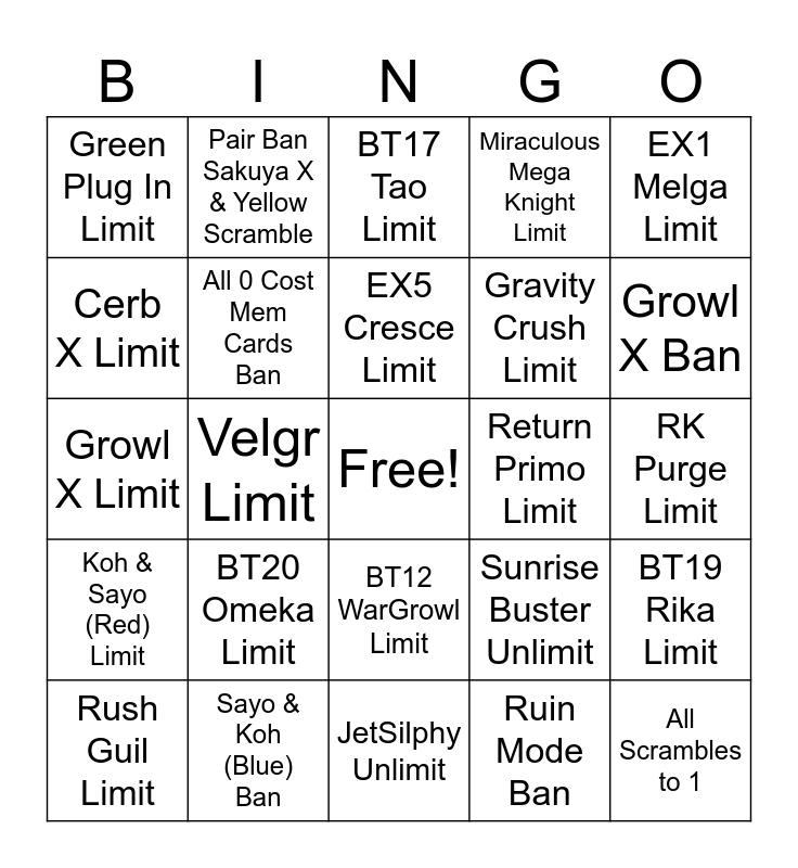 This bingo card has a free space and 24 words: Rush Guil Limit, BT20 Omeka Limit, EX5 Cresce Limit, Ruin Mode Ban, EX1 Melga Limit, Green Plug In Limit, Pair Ban Sakuya X & Yellow Scramble, BT17 Tao Limit, Return Primo Limit, RK Purge Limit, Growl X Limit, All 0 Cost Mem Cards Ban, Sunrise Buster Unlimit, BT19 Rika Limit, Cerb X Limit, Sayo & Koh (Blue) Ban, JetSilphy Unlimit, Miraculous Mega Knight Limit, Growl X Ban, Koh & Sayo (Red) Limit, Velgr Limit, BT12 WarGrowl Limit, Gravity Crush Limit and All Scrambles to 1.