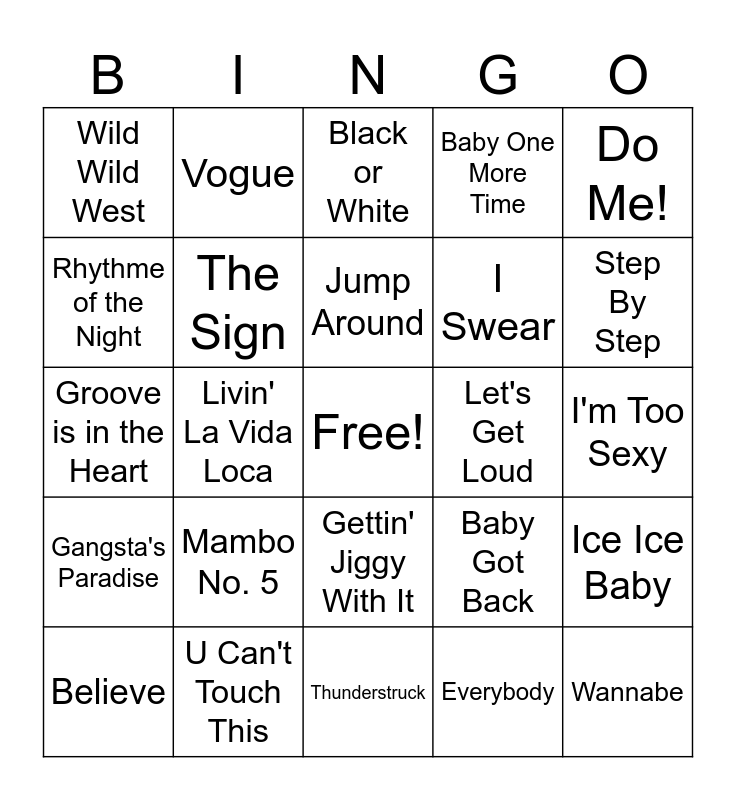 This bingo card has a free space and 24 words: Mambo No. 5, U Can't Touch This, Jump Around, Believe, Do Me!, Wild Wild West, Rhythme of the Night, Vogue, Let's Get Loud, Gettin' Jiggy With It, I Swear, Groove is in the Heart, Baby Got Back, Ice Ice Baby, The Sign, Everybody, I'm Too Sexy, Black or White, Step By Step, Livin' La Vida Loca, Wannabe, Gangsta's Paradise, Baby One More Time and Thunderstruck.
