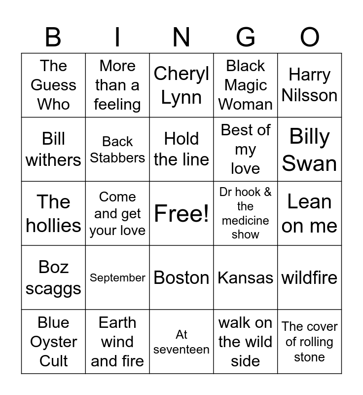 This bingo card has a free space and 57 words: (Don't Fear) The Reaper, Blue Oyster Cult, American Woman, The Guess Who, At seventeen, Janis Ian, Back Stabbers, The O'jays, Best of my love, The emotions, Black Magic Woman, Santana, Brandy (you're a fine girl), Cat scratch fever, Ted Nugent, Coconut, Harry Nilsson, Come and get your love, Redbone, The cover of rolling stone, Dr hook & the medicine show, Dust in the wind, Kansas, Cheryl Lynn, Got to be real, Hold the line, Toto, I can help, Billy Swan, I can see clearly now, Johnny Nash, I go crazy, Paul Davis, Lady Marmalade, Lean on me, Bill withers, Long cool woman, The hollies, Low down, Boz scaggs, More than a feeling, Boston, Play that funky music, Wild cherry, Please come to boston, Dave Loggins, September, Earth wind and fire, Surrender, Cheap trick, Two tickets to paradise, walk on the wild side, lou reed, When Will I see you again, the three degrees, wildfire and Michael martin murphy.