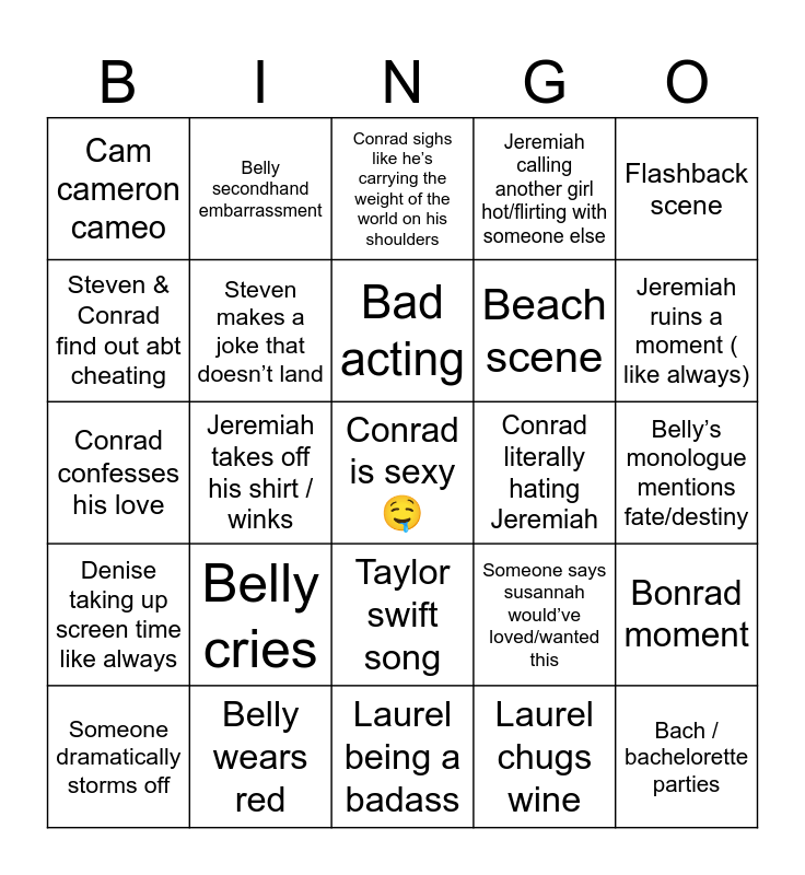 This bingo card has a free space and 24 words: Belly cries, Belly wears red, Bad acting, Someone dramatically storms off, Flashback scene, Cam cameron cameo, Steven & Conrad find out abt cheating, Belly secondhand embarrassment, Conrad literally hating Jeremiah, Taylor swift song, Beach scene, Conrad confesses his love, Someone says susannah would’ve loved/wanted this, Bonrad moment, Steven makes a joke that doesn’t land, Laurel chugs wine, Belly’s monologue mentions fate/destiny, Conrad sighs like he’s carrying the weight of the world on his shoulders, Jeremiah ruins a moment ( like always), Jeremiah takes off his shirt / winks, Bach / bachelorette parties, Denise taking up screen time like always, Jeremiah calling another girl hot/flirting with someone else and Laurel being a badass.