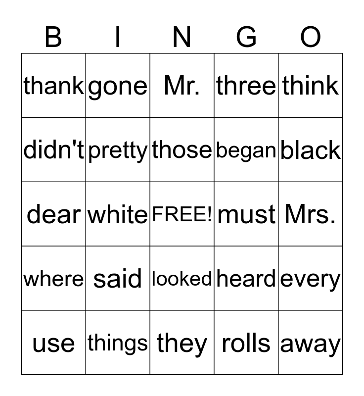 This bingo card has a free space and 24 words: said, things, those, use, think, thank, didn't, gone, must, looked, began, dear, heard, every, pretty, rolls, Mrs., Mr., black, white, away, where, three and they.