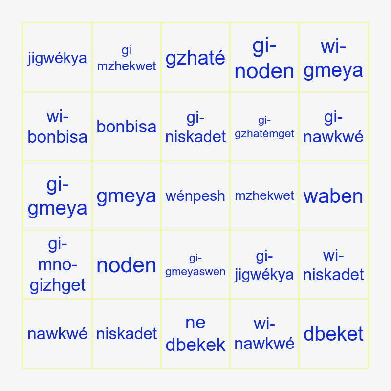 This bingo card has a free space and 29 words: nawkwé, mno-gizhget, gmeya, gmeyaswen, jigwékya, gzhaté, bonbisa, noden, mzhekwet, niskadet, waben, dbeket, ne dbekek, wi-nawkwé, gi-nawkwé, wi-mno-gizhget, gi-gmeyaswen, gi-mno-gizhget, wi-gmeya, gi-gmeya, gi-jigwékya, wi-gzhatémget, gi-gzhatémget, wi-bonbisa, gi-noden, gi mzhekwet, wi-niskadet, gi-niskadet and wi-waben.