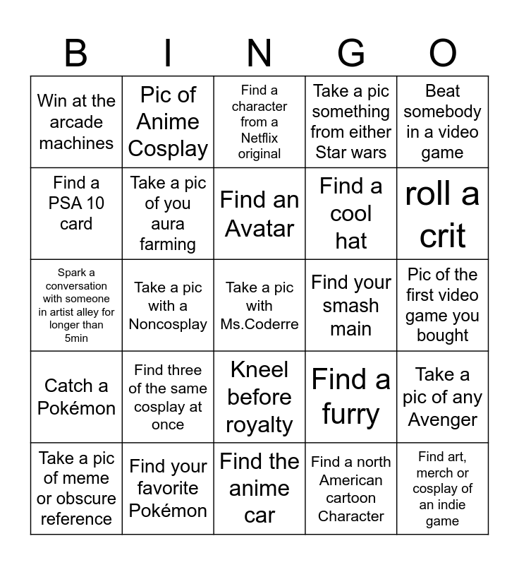 This bingo card has a free space and 24 words: Find three of the same cosplay at once, Find your favorite Pokémon, Find an Avatar, Take a pic of meme or obscure reference, Beat somebody in a video game, Win at the arcade machines, Find a PSA 10 card, Pic of Anime Cosplay, Find your smash main, Kneel before royalty, Find a cool hat, Spark a conversation with someone in artist alley for longer than 5min, Find a furry, Take a pic of any Avenger, Take a pic of you aura farming, Find a north American cartoon Character, Pic of the first video game you bought, Find a character from a Netflix original, roll a crit, Take a pic with a Noncosplay, Find art, merch or cosplay of an indie game, Catch a Pokémon, Take a pic something from either Star wars and Find the anime car.