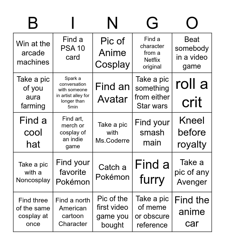 This bingo card has a free space and 24 words: Find three of the same cosplay at once, Find your favorite Pokémon, Find an Avatar, Take a pic of meme or obscure reference, Beat somebody in a video game, Win at the arcade machines, Find a PSA 10 card, Pic of Anime Cosplay, Find your smash main, Kneel before royalty, Find a cool hat, Spark a conversation with someone in artist alley for longer than 5min, Find a furry, Take a pic of any Avenger, Take a pic of you aura farming, Find a north American cartoon Character, Pic of the first video game you bought, Find a character from a Netflix original, roll a crit, Take a pic with a Noncosplay, Find art, merch or cosplay of an indie game, Catch a Pokémon, Take a pic something from either Star wars and Find the anime car.