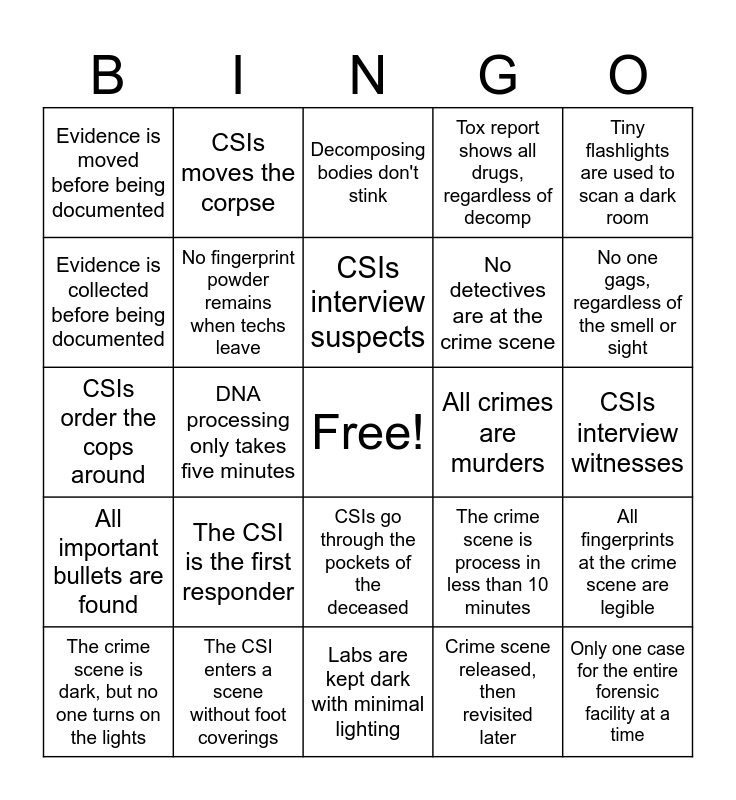 This bingo card has a free space and 24 words: The CSI is the first responder, The CSI enters a scene without foot coverings, CSIs interview suspects, The crime scene is dark, but no one turns on the lights, Tiny flashlights are used to scan a dark room, Evidence is moved before being documented, Evidence is collected before being documented, CSIs moves the corpse, All crimes are murders, CSIs go through the pockets of the deceased, No detectives are at the crime scene, CSIs order the cops around, The crime scene is process in less than 10 minutes, All fingerprints at the crime scene are legible, No fingerprint powder remains when techs leave, Crime scene released, then revisited later, CSIs interview witnesses, Decomposing bodies don't stink, No one gags, regardless of the smell or sight, DNA processing only takes five minutes, Only one case for the entire forensic facility at a time, All important bullets are found, Tox report shows all drugs, regardless of decomp and Labs are kept dark with minimal lighting.