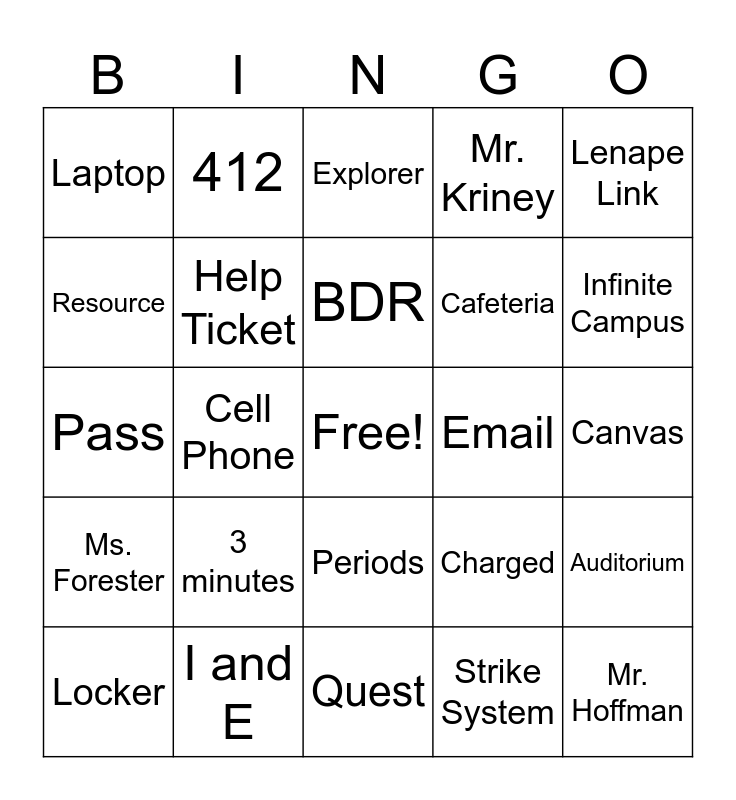 This bingo card has a free space and 24 words: 3 minutes, I and E, BDR, Locker, Lenape Link, Laptop, Resource, 412, Email, Periods, Cafeteria, Pass, Charged, Auditorium, Help Ticket, Strike System, Canvas, Explorer, Infinite Campus, Cell Phone, Mr. Hoffman, Ms. Forester, Mr. Kriney and Quest.